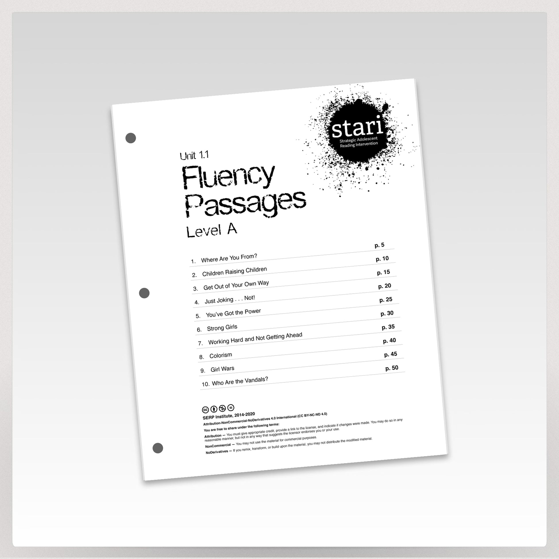 Fluency passages are 3-hole punched, with a tab divider labeled with fluency level; shrink-wrapped.