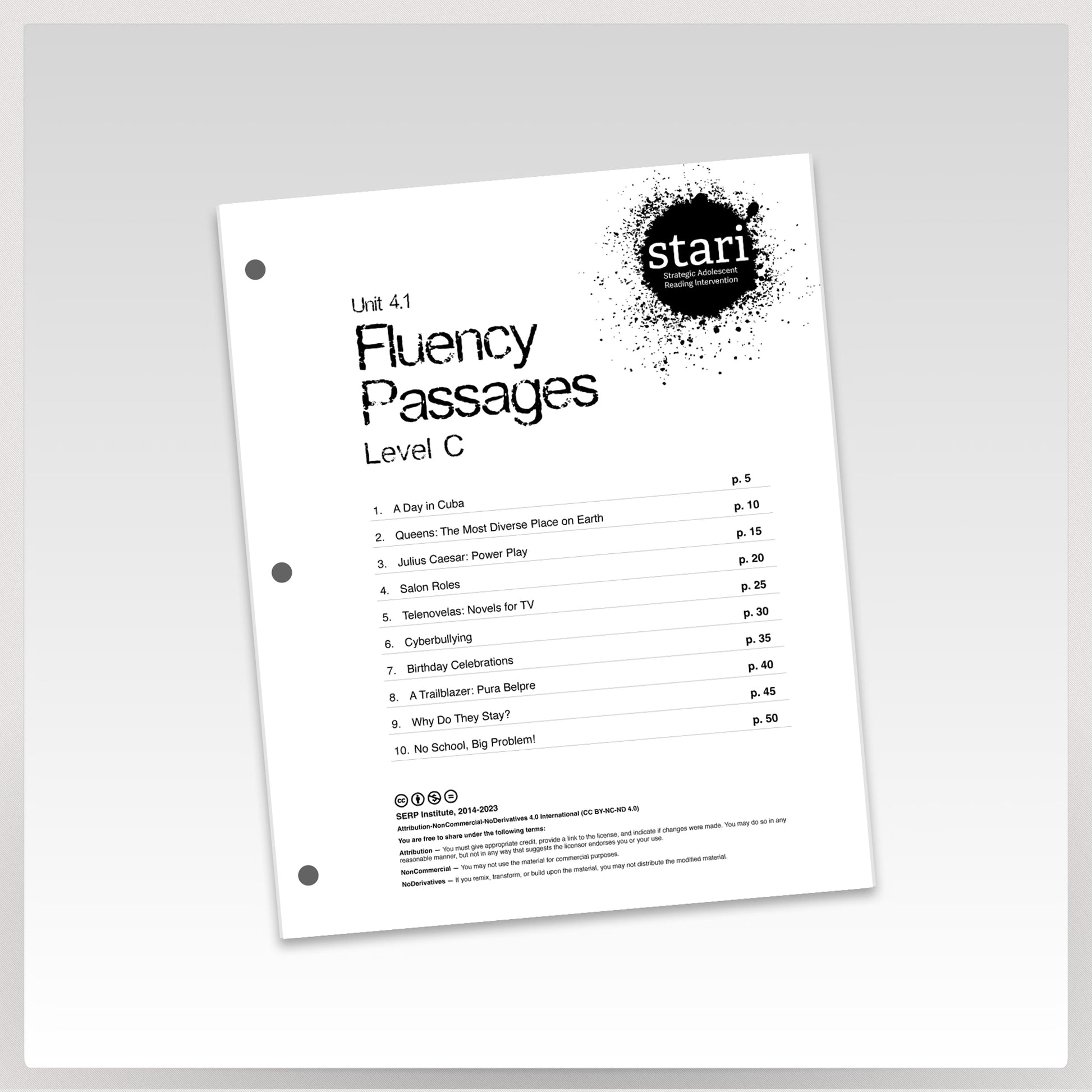 Fluency passages are 3-hole punched, with a tab divider labeled with fluency level; shrink-wrapped.